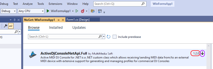 | • | Once selected, after clicking the "Browse" tab, all of the MultiMedia Soft NuGet packages installed on the development machine will be displayed (in this case a Trial version of the component) |