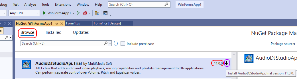 | • | Once selected, after clicking the "Browse" tab, all of the MultiMedia Soft NuGet packages installed on the development machine will be displayed (in this case a Trial version of the component) |