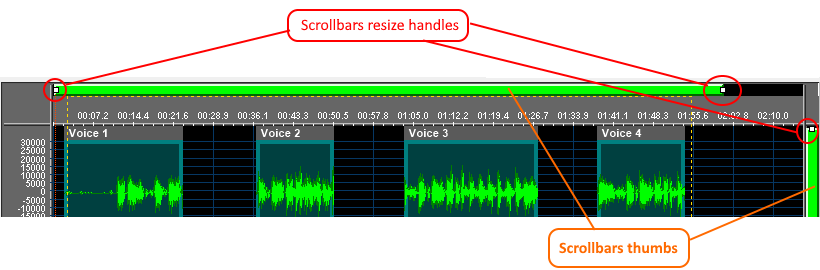 Zoom operations are supported programmatically through the TracksBoard.ZoomIn, TracksBoard.ZoomOut and TracksBoard.ZoomToFullSound methods or through the mouse by moving the scrollbars handles. In case you should need to display a specific range of the session, the TracksBoard.DisplayRangeSet would be the way to go. Once zoomed, the visible range of the session can be scrolled programmatically through the TracksBoard.Scroll method or through the mouse by moving the scrollbars thumbs; the zoom-in capability is limited to the number of peaks available for rendering the waveform of items added to the session so, when using the horizontal scrollbar, the zoom-in operation is automatically interrupted when there are not enough peaks to proceed further.