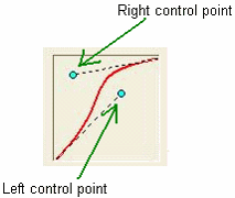 The custom curve designer manages a windowed control, whose visual aspect can be defined programmatically, which allows designing volume curves based upon Bézier curves whose shape is defined through the manual positioning of 2 control points (displayed in cyan color on the graphic below). For further information about the use of the embedded CurveDesigner refer to the tutorial How to create custom volume curves.