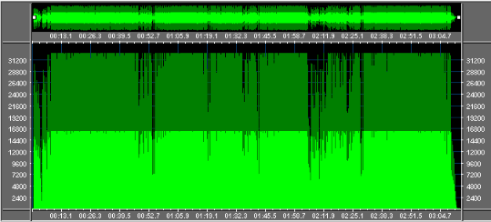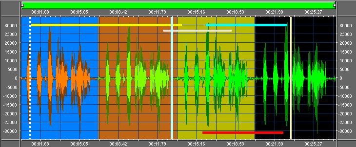 In the image above the left channel, which is represented on top respect to the right channel, is rendered through the cyan line and through the blue area while the left channel, partially covered by the left channel, is rendered through the red line and through the darker red area; the portion of right channel area covered by the left channel's area is rendered in violet.