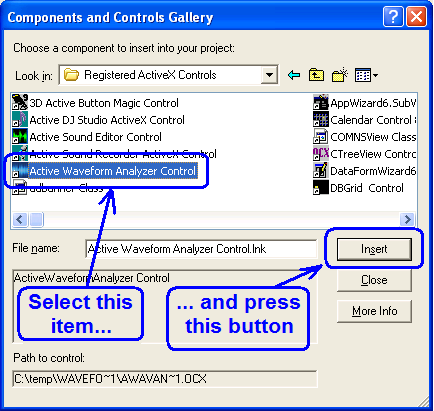 | • | From the "Components and Controls Gallery", select the "Active Waveform Analyzer Control" element as seen in the screenshot below and press the Insert button |