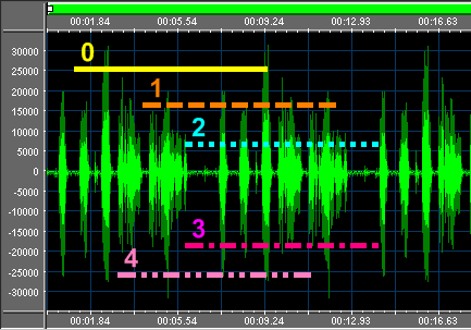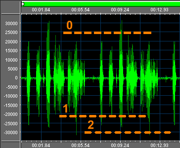 On the screenshot below you can see 3 horizontal lines, 2 on positive peaks, respectively at 70% and 25% of the waveform amplitude, and one on negative peaks at -80% of the waveform amplitude.