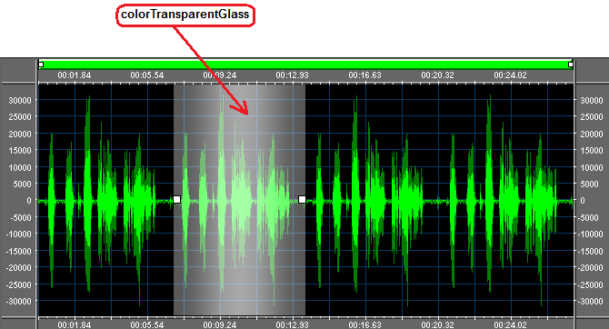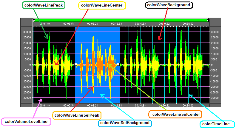 Color used for rendering the waveform background when selected. See screenshot A above. This setting is ignored when the nSelectionMode field above is set to a value different from WAVE_SEL_CUSTOM_COLORS. |