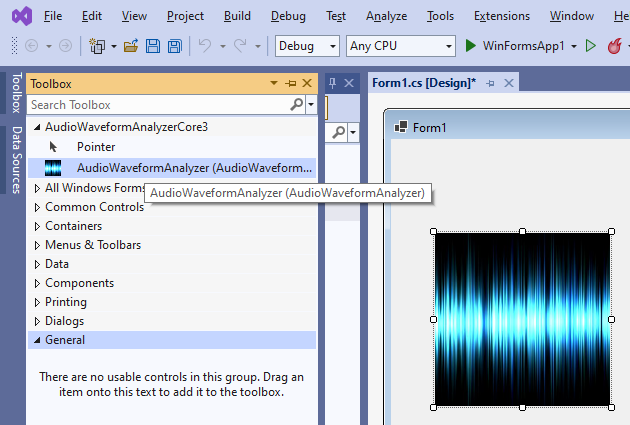 • | Open the "Toolbox" and drag the AudioWaveformAnalyzer component into the container form: this will display the component's window where the user interface of the waveform analyzer will be rendered |