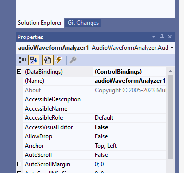 As mentioned on a previous paragraph, with .NET 5 and newer versions available editing features of components at design time are quite limited so we had to find a sort of bridge for allowing the possibility to integrate the Waveform Analyzer Visual Editor application within Visual Studio. In order to launch this application you must locate the AccessVisualEditor property inside the "Properties" window and change its value from "False" to "True":