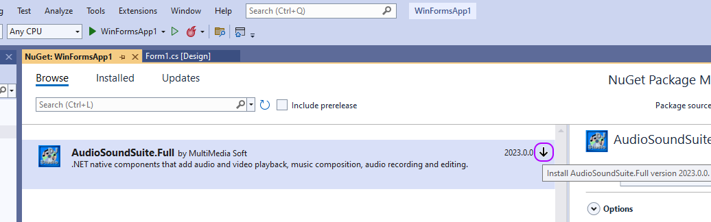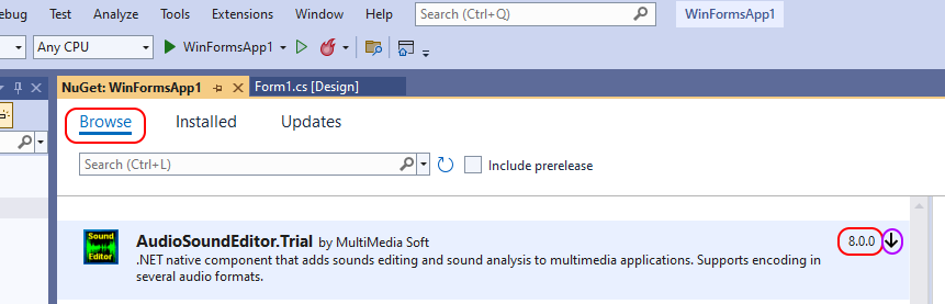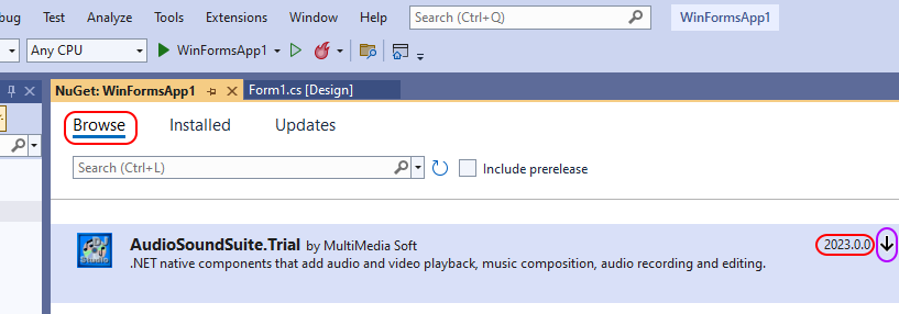 | • | Once selected, after clicking the "Browse" tab, all of the MultiMedia Soft NuGet packages installed on the development machine will be displayed (in this case a Trial version of the component) |