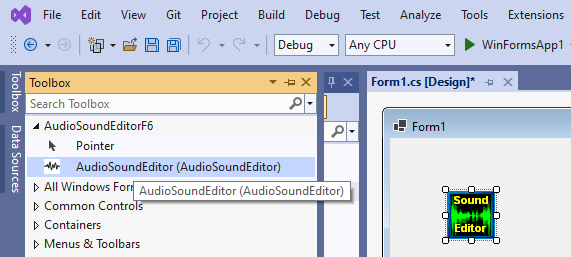 | • | Open the "Toolbox" and drag the AudioSoundEditor component into the container form: this will display the component's icon inside the form; the icon will be visible at design-time only and hidden at runtime |