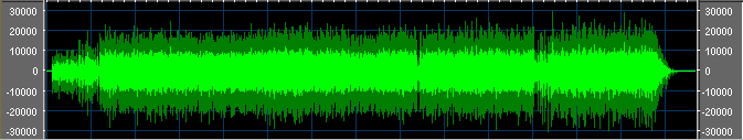 Many multimedia applications allow displaying a waveform scroller whose purpose is to scroll the waveform during playback and to keep the current position centered on the scrolling waveform, with a vertical line that indicates the effective playback position; the screenshot below shows a song's waveform when playback position is 0, meaning that the sound is stopped or paused: